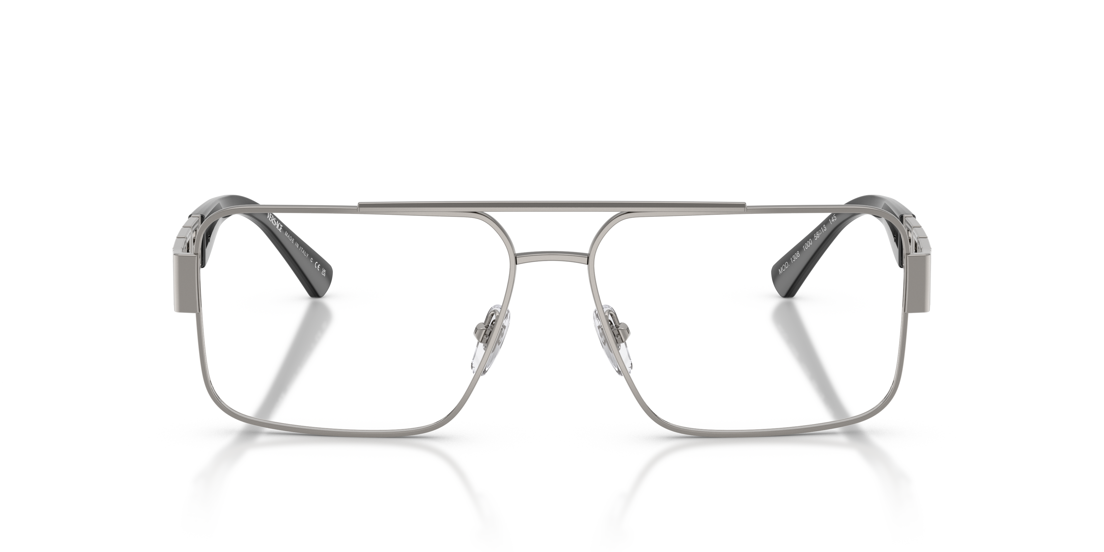 De Versace VE1308 heeft een moderne kussenvorm in slank metaal, met zachte verstelbare neuspads voor een persoonlijke pasvorm. De dubbele neusbrug geeft architectonische flair; de versierde veren tonen het Greca-motief—een iconisch Versace-detail.